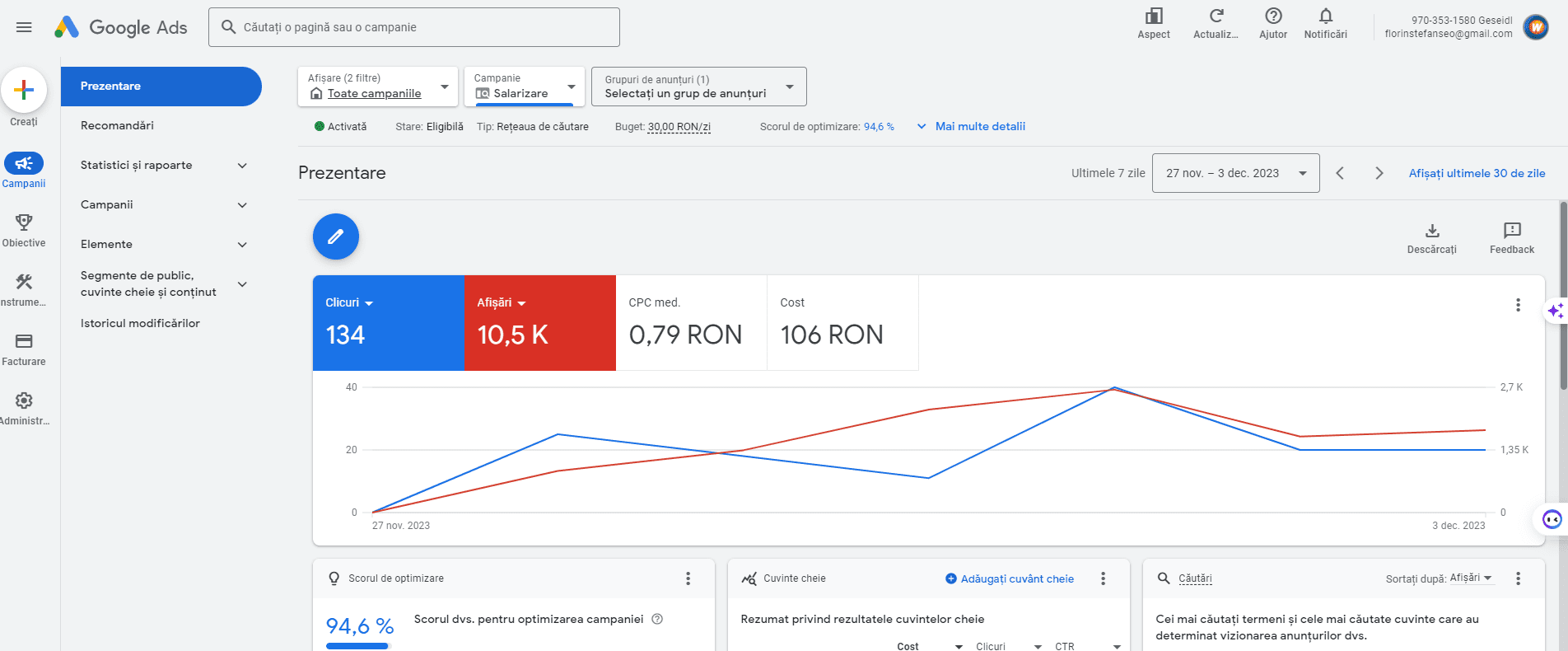 O campanie Google ads optimizată de echipa Weryon. Mai jos aveți adăugat un print extras la ora publicării acestui articol. Cu o rată de optimizare de 94% și un cost PPC destul de decent putem afirma încă de pe acum că se anunță un real succes!